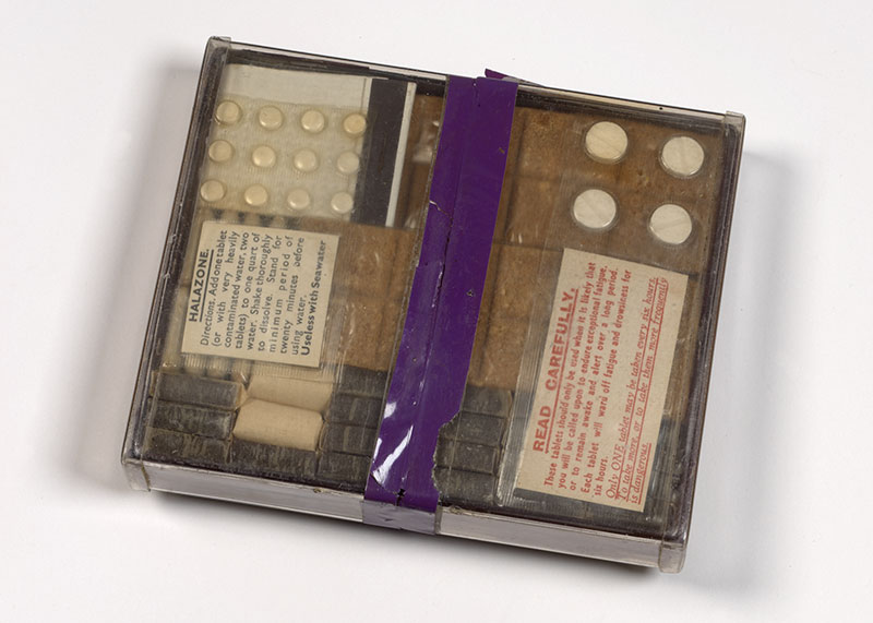 A military survival kit from the Second World War containing benzedrine (amphetamine) tablets